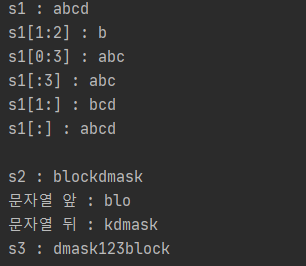 print(f"s1[0:3] : {s1[0:3]}")