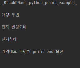 두번째 예제 에서는 end="\n\n" 이렇게 end 옵션을 개행 두번으로 변경해보았습니다. print함수가 불릴 때마다 출력을 다하고 마지막에 개행이 두번씩 이루어진 것을 볼 수 있습니다.