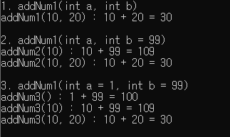 물론 void addNum(int a = 20, int b = 10) 이렇게 두 인자 모두 디폴트 값을 지정해 줄 수 있습니다.