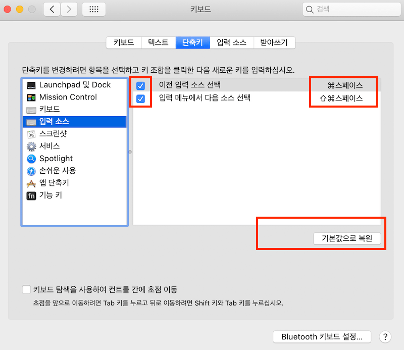 그럼 화면 맨 왼쪽위에 사과모양 -> 시스템 환경설정 -> 키보드 -> 단축키 항목으로 들어가게되면