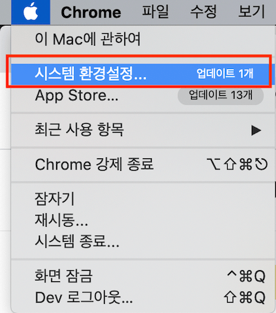 1-1) 왼쪽위의 사과 버튼 -> 시스템 환경설정으로 갑니다.
