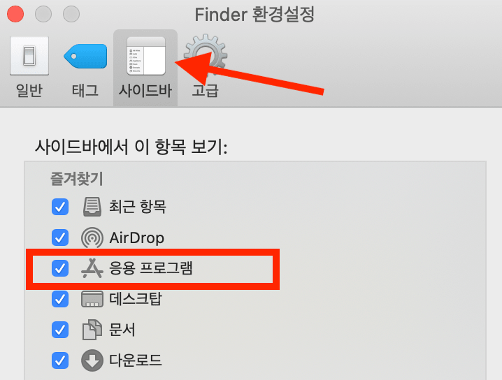 응용프로그램이 없는 경우 finder 환경설정 -> 사이드바 -> 즐겨찾기에 응용프로그램 추가
