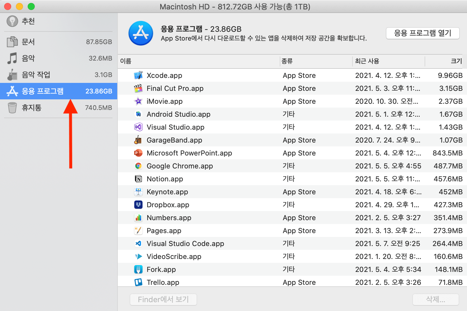 finder 에서 앱이 안보이거나 하는 경우에는 저장공간에서 앱을 정리하는 방법이 있습니다.