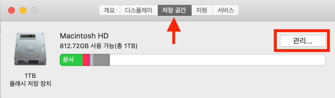3-2) 맥에 관한 창이 하나 뜨면 가운데 "저장공간"을 클릭하고 "관리"를 클릭해줍니다.