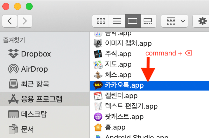 여기서 지우고 싶은 앱을 클릭합니다. 그 상태에서 Command + ⌫ (삭제버튼) 을 눌러주면 삭제가 됩니다.