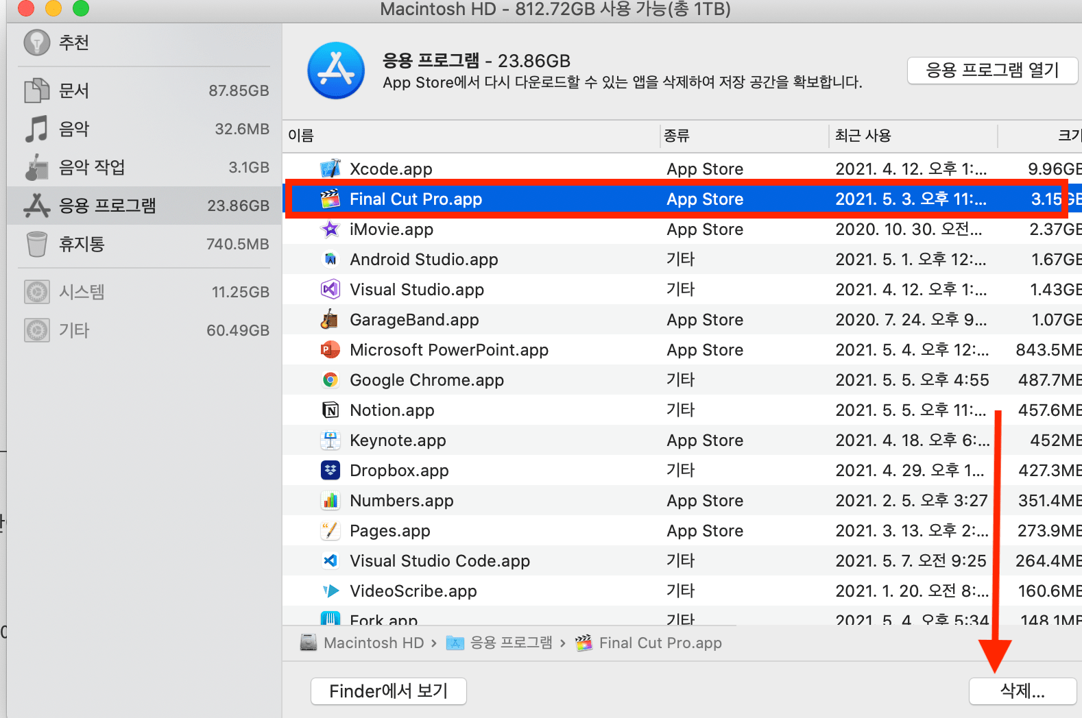3. 맥북 저장공간에서 앱 삭제