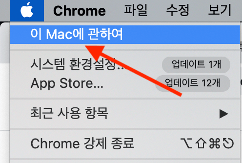 3-1) 화면 좌측 상단의 사과모양을 클릭해서 "이 Mac에 관하여"를 클릭합니다.