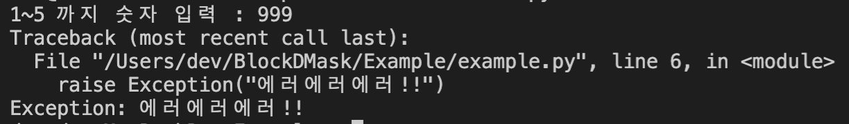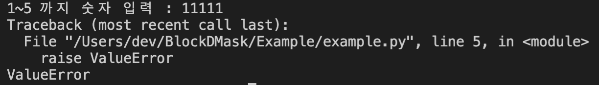 그러나, 범위에 벗어나는 숫자를 입력하면 우리가 작성한 if 조건문에 걸려서 raise 를 타게되어 에러가 발생해 프로그램이 죽는것을 볼 수 있습니다.