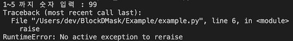 이런식으로 raise 를 이용해서 일부러 에러를 발생시킬 수 있습니다.