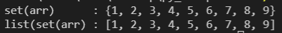 두 번째 결과를 보면 set(arr) 했던걸 다시 list(set(arr))을 통해서 {} => [] 괄호로 변경된 것을 볼 수 있습니다.