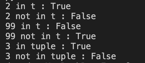 튜플도 위에 리스트와 마찬가지로 튜플 앞에 in을 붙이고 확인하고자 하는 값을 집어넣어서 사용하면 됩니다.