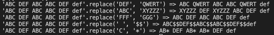 첫 번째 테스트인 name.replace("DEF", "QWERT")를 보면 따로 세 번째 인자인 횟수를 입력하지 않고 진행을 시키니 문자열 name 안에 있는 모든 "DEF"를 찾아서 "QWERT"로 변경한 것을 알 수 있습니다.