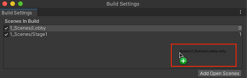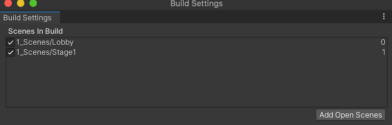 (1) 버튼 "Add Open Scene"을 통해서 현재 오픈되어있는 씬을 넣을 수 있습니다.