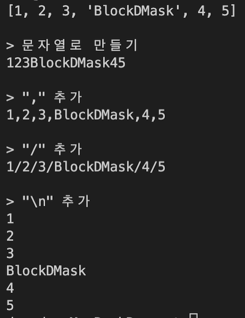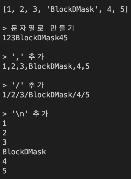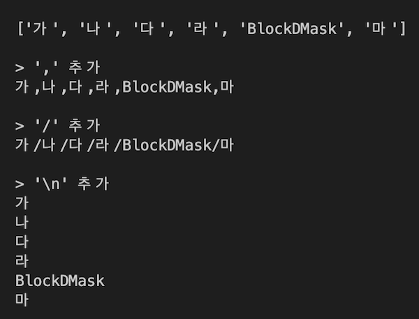 위 결과를 보면 이렇게 구분자를 추가해서 리스트의 문자열을 이쁘장하게 만들 수 있습니다.