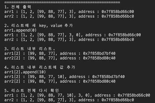 arr1[2], arr2[2] 의 [99, 88, 77]인 리스트 내부 리스트도 주소 값이 다른 것을 볼 수 있습니다.