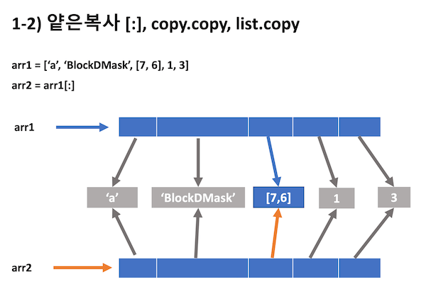 arr1을 [:] 리스트 슬라이싱을 통해서 arr2에 복사를 했습니다.