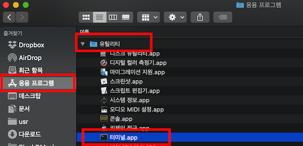 - finder(탐색기) -> 응용 프로그램 -> 유틸리티 -> 터미널을 찾아서 열어주세요.