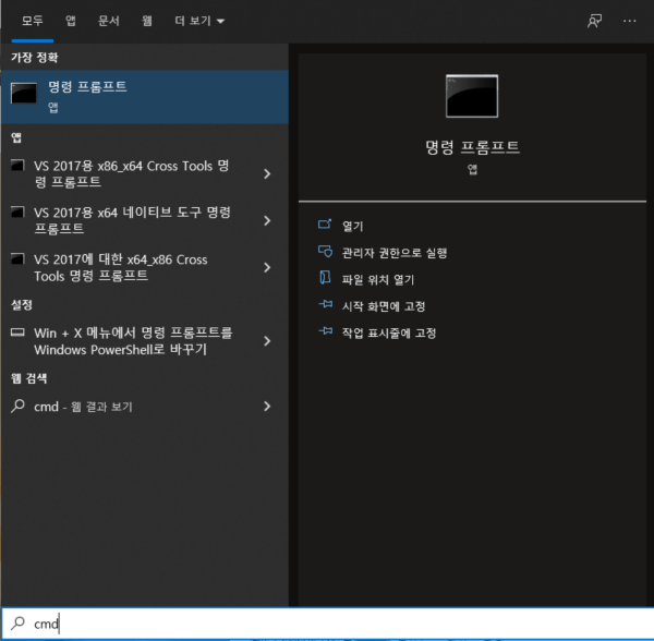- 윈도우키를 눌러서 cmd 라고 검색해도 됩니다.