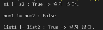 num1 != num2의 결과가 False 가 나온 것을 알 수 있습니다.