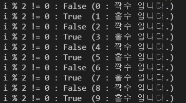 print(f'i % 2 != 0 : False ({i} : 짝수 입니다.)')