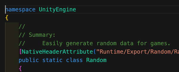 위 캡처에서 namespace UnityEngine 안에 public static class Random 이라는 클래스가 존재하는 것을 볼 수 있습니다.