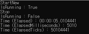 또한 sw.Elapsed, sw.ElapsedMilliseconds, sw.ElapsedTicks 필드를 출력해보면 각각 포멧에 맞게 시간을 출력하는 것을 알 수 있습니다.