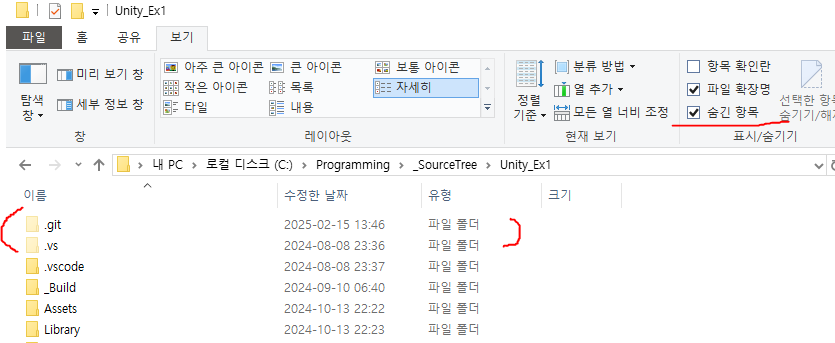 - “숨긴 항목” 체크박스를 체크합니다. (숨김 파일 표시)