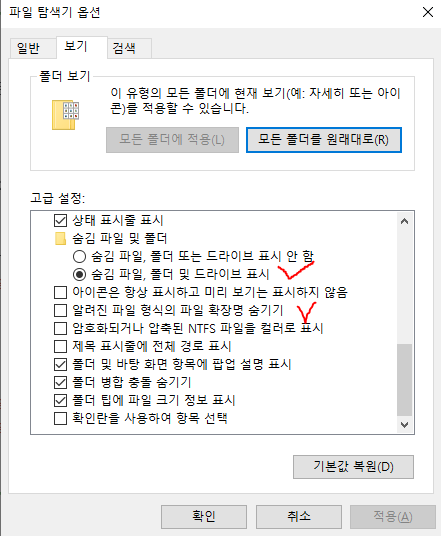 - “숨김 파일, 폴더 및 드라이브 표시” → 체크