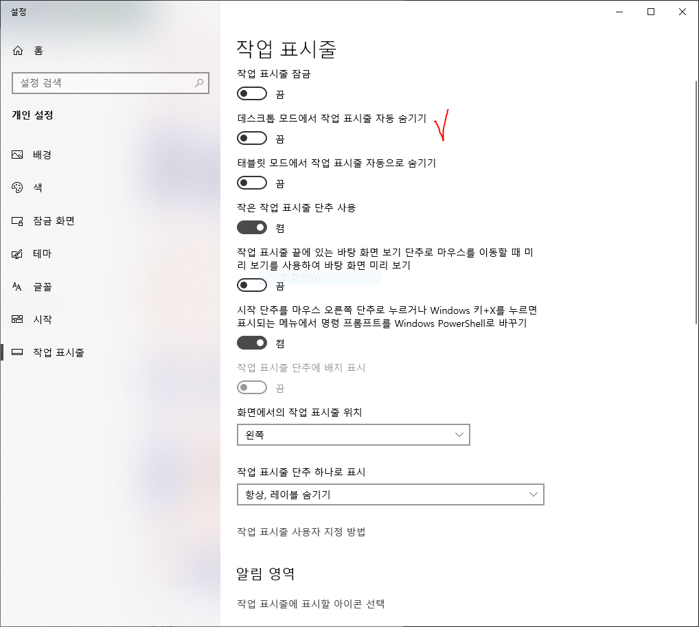 - “작업 표시줄 자동 숨기기” 옵션이 켜져 있다면 꺼주세요.