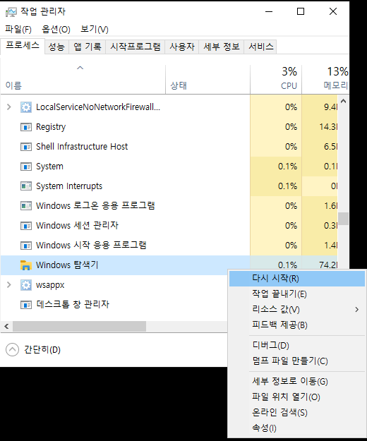 Ctrl + Shift + Esc→ 작업 관리자 실행- 목록에서 “Windows 탐색기” 찾기