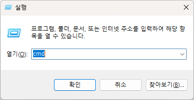 실행창이 열리면 cmd 를 입력하고 Enter를 누릅니다.